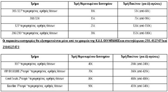 Για εισιτήρια ακριβότερων κατηγοριών και VIP, παρακαλούμε απευθυνθείτε στα γραφεία της Κ.Α.Ε. ΟΛΥΜΠΙΑΚΟΣ και στο τηλέφωνο 210 4527600.