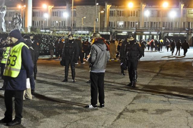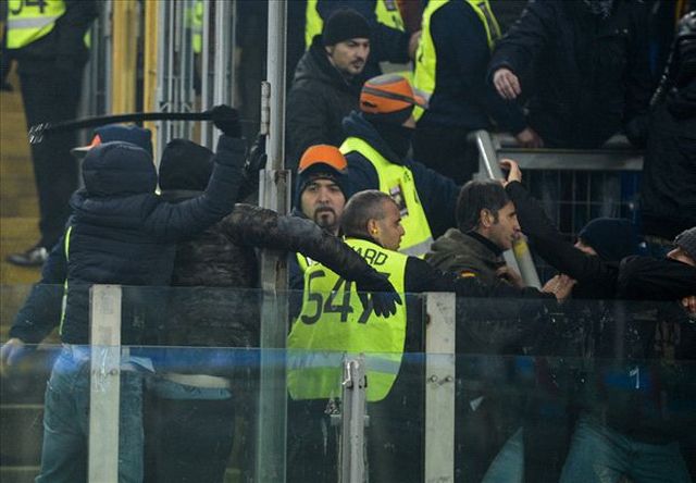 Η επέμβαση της αστυνομίας ήταν άμεση και δεν υπήρξε συνέχεια, ενώ με το τέλος του αγώνα και εκτός γηπέδου συνεχίστηκαν τα επεισόδια που δεν είχαν όμως μεγάλη έκταση, ενώ σύμφωνα με τα ιταλικά Μέσα υπήρξε και ένας τραυματισμένος αστυνομικός από ένα βεγγαλικό που του έριξαν οι θερμοκέφαλοι οπαδοί.