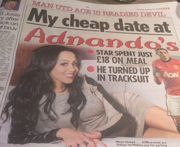«Γνωριστήκαμε μέσω σελίδας κοινωνικής δικτύωσης και κλείσαμε ραντεβού. Εγώ έβαλα τα καλά μου, πήγα ακόμη και σε επαγγελματία μακιγιέρ δίνοντας 30 λίρες και περίμενα να έρθει με κάποιο ακριβό αυτοκίνητο να με πάρει. Όμως εκείνος ήρθε φορώντας μια φόρμα και καταλήξαμε να τον οδηγώ εγώ με το παλιό μου Fiesta. Όταν μου είπε πως θα με πάει στο ‘Nando’s’ απογοητεύτηκα», δήλωσε η νεαρά στην εφημερίδα, που έχει τίτλο «Το φτηνό μου ραντεβού. Ο σταρ της Μαν. Γιουνάιτεντ ξόδεψε μόλις 18 λίρες για φαγητό».