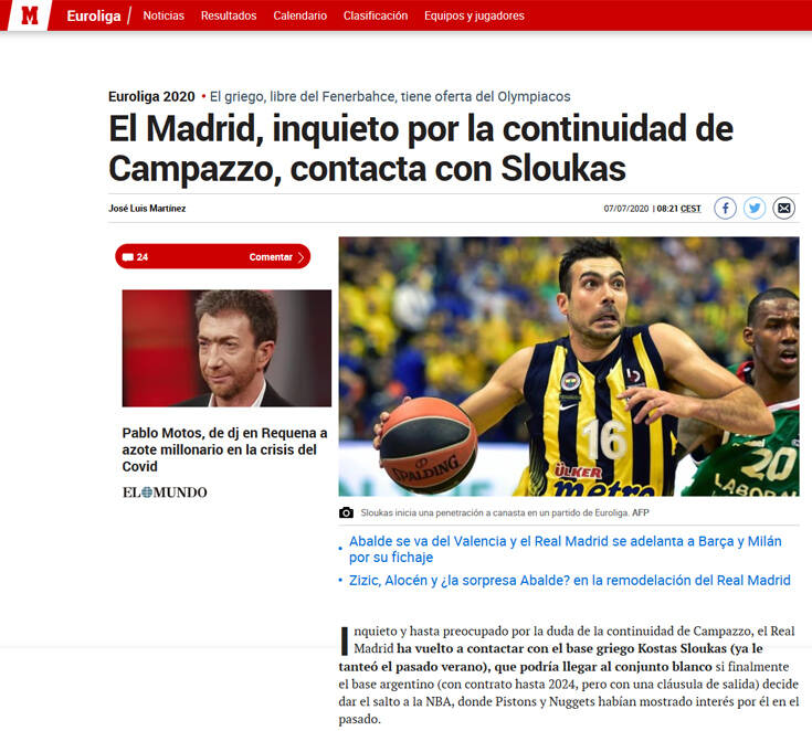 Στο άρθρο επισημαίνεται πως η «Βασίλισσα» ανησυχεί για το εάν ο Φακούντο Καμπάτσο θα παραμείνει στην ομάδα ή θα προτιμήσει το ΝΒΑ και γι’ αυτό το λόγο έκανε επαφή με τον Κώστα Σλούκα, ώστε να δει τις προθέσεις του.