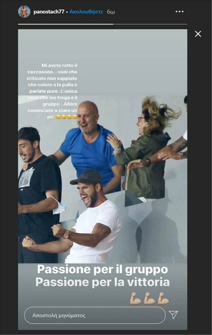«Μου έχετε σπάσει τον… Δεν ξέρετε καν τι χρώμα έχει η μπάλα και μιλάτε κιόλας. Το μόνο που με ενδιαφέρει είναι η ομάδα, το γκρουπ. Πάθος για το γκρουπ. Πάθος για τη νίκη», ήταν το μήνυμα του Έλληνα ποδοσφαιριστή.