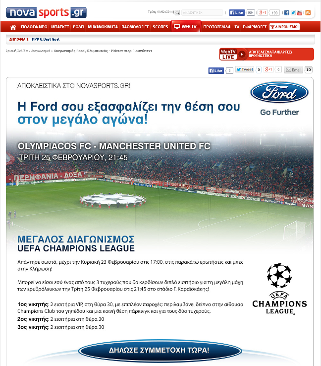 O μεγάλος διαγωνισμός της Ford για τον αγώνα Champions League, Ολυμπιακός – Μάντσεστερ Γιουνάιτεντ την Τρίτη 25 Φεβρουαρίου, είναι αποκλειστικά στο Νovasports.gr! H Ford, επίσημος χορηγός του UEFA Champions League και το Novasports.gr δίνουν την ευκαιρία σε 3 τυχερούς να κερδίσουν διπλό εισιτήριο για τη μεγάλη μάχη των «ερυθρόλευκων» με τους «κόκκινους διαβόλους» στο γήπεδο «Γ. Καραϊσκάκης» στο πλαίσιο της πρώτης αναμέτρησης των δύο ομάδων για την φάση των «16» της κορυφαίας διασυλλογικής διοργάνωσης. O 1ος νικητής θα κερδίσει 2 εισιτήρια VIP με επιπλέον παροχές, όπως δείπνο στην αίθουσα Champions Club του γηπέδου και θέση πάρκινγκ. Ο 2ος νικητής & o 3ος νικητής θα κερδίσoυν από 2 εισιτήρια στη θύρα 30.