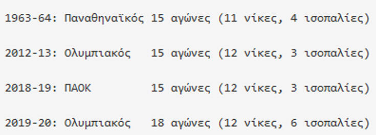 Και βέβαια αήττητοι εκτός έδρας τερμάτισαν και ο Παναθηναϊκός και ο ΠΑΟΚ, το 1964 και το 2019 αντίστοιχα, όταν άλλωστε έκαναν το απόλυτο αήττητο στο πρωτάθλημα. Οι ομάδες που ολοκλήρωσαν το πρωτάθλημα αήττητες εκτός έδρας: