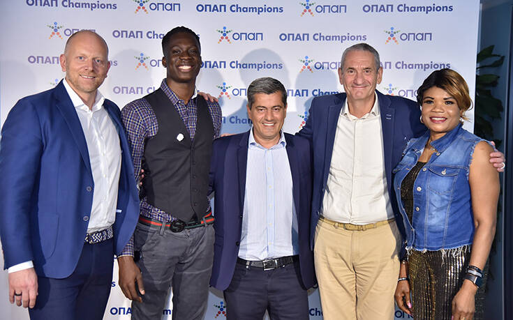 Ο Acting CEO του ΟΠΑΠ Γιαν Κάρας, ο ΟΠΑΠ Champion Άλεξ Αντετοκούνμπο, ο Αναπληρωτής Διευθύνων Σύμβουλος του ΟΠΑΠ Οδυσσέας Χριστοφόρου, ο Εκτελεστικός Πρόεδρος του ΟΠΑΠ Καμίλ Ζίγκλερ και η Βερόνικα Αντετοκούνμπο