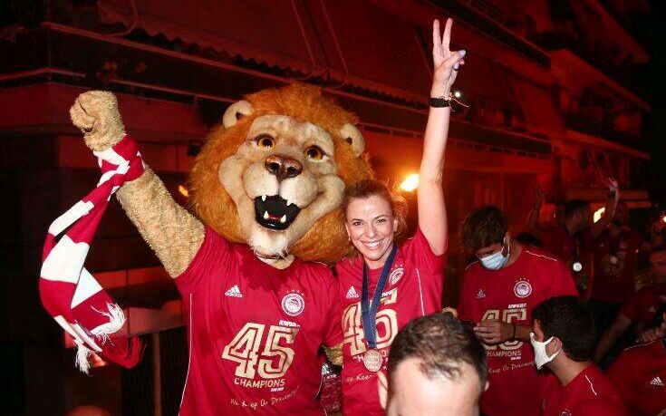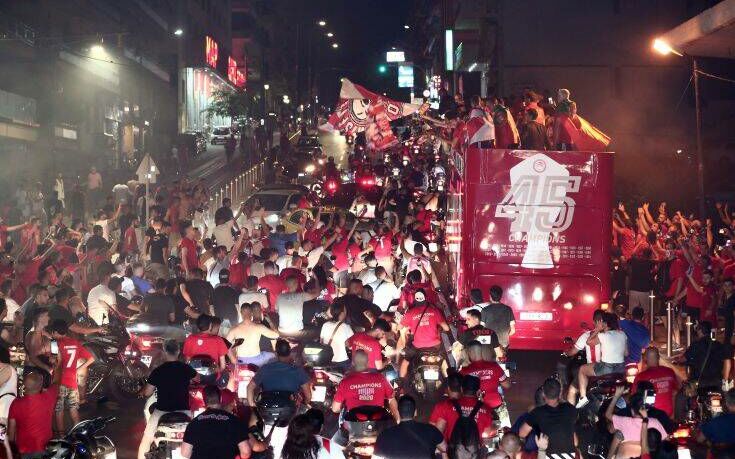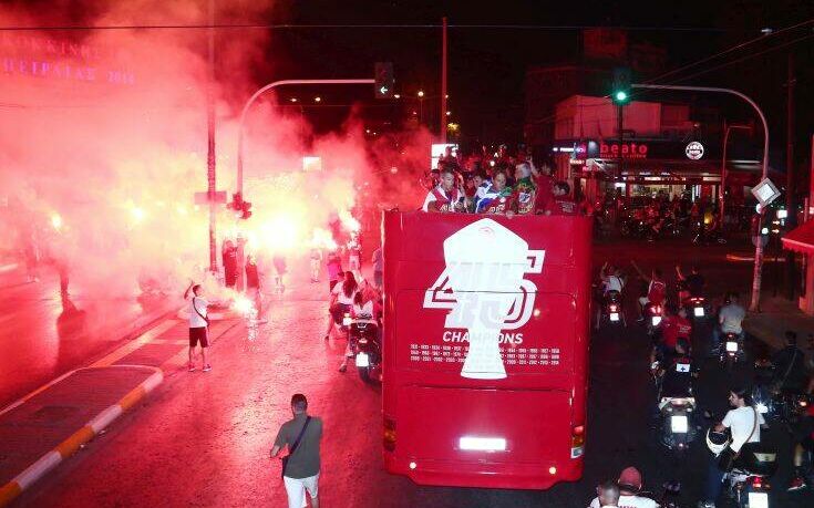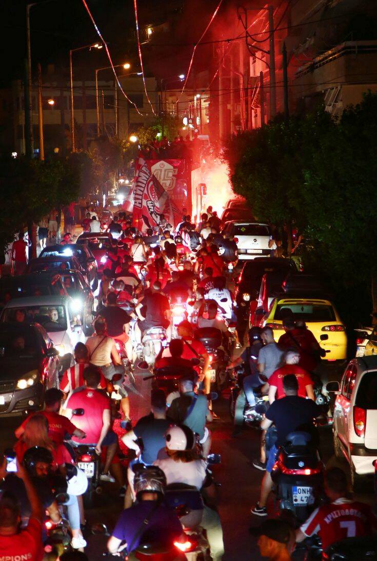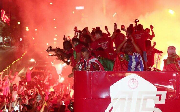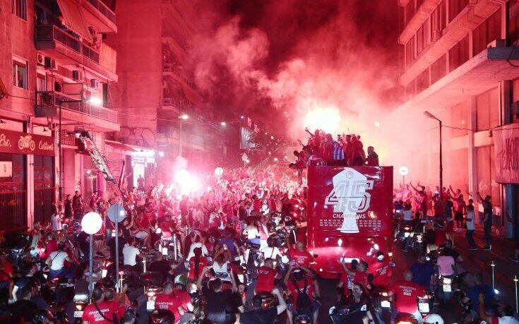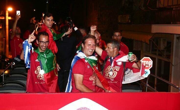 Μετά την απονομή στο Καραϊσκάκη, όλη η ομάδα του Ολυμπιακού ανέβηκε στο πούλμαν και ξεκίνησε η πορεία τους στους δρόμους του Πειραιά για να πανηγυρίσουν τον 45ο τίτλο της ιστορίας τους μαζί με τους φίλους της ομάδας.