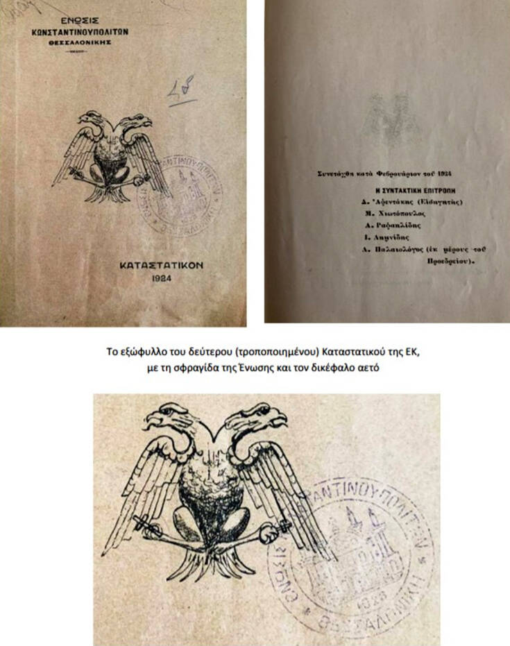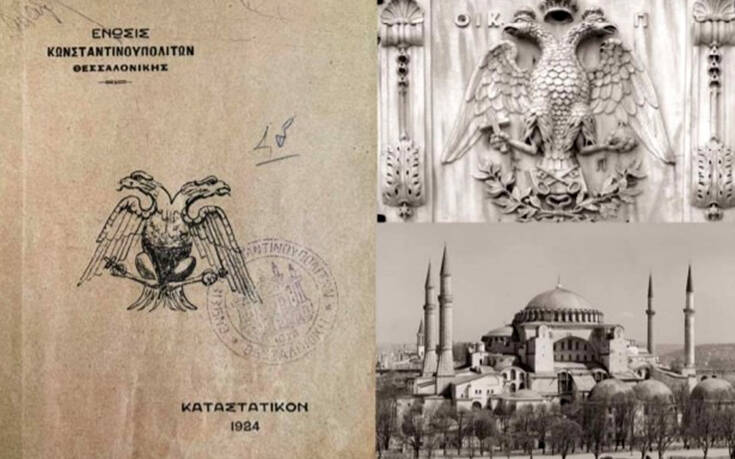 Αγία Σοφία… και 1453… Δεν θα μπορούσε βέβαια να λείψει από την Ένωση Κωνσταντινουπολιτών της Θεσσαλονίκης και ο δικέφαλος αετός! Στο εξώφυλλο του Καταστατικού του 1924 δεσπόζει μάλιστα ένας δικέφαλος αετός που μόνο τυχαίος δεν είναι!