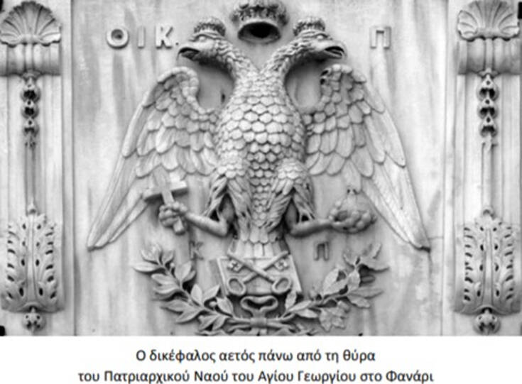 Παρατηρώντας τον δικέφαλο της ΕΚ βλέπουμε ότι ο αετός κρατάει στο ένα πόδι τη σφαίρα με τον σταυρό, που συμβολίζει την παλιά χριστιανική βυζαντινή οικουμένη, αλλά στο άλλο πόδι κρατά όχι σπαθί, αλλά πάλι ένα σταυρό! Δεν είναι δηλαδή ο κλασικός δικέφαλος που χρησιμοποιούν όλοι όσοι οικειοποιούνται το καθιερωμένο εκκλησιαστικό σύμβολο. Γιατί διάλεξαν αυτόν το δικέφαλο οι πρόσφυγες Κωνσταντινουπολίτες; Η απάντηση είναι απλή. Γιατί αυτός ο δικέφαλος είναι ο θυρεός του Αγίου Γεωργίου στο Πατριαρχείο, στο Φανάρι!
