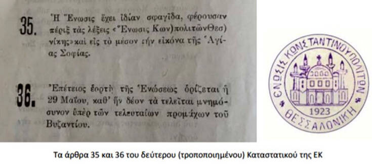Εκτός από τη σφραγίδα τους, οι Κωνσταντινουπολίτες πρόσφυγες στο τροποποιημένο καταστατικό της Ένωσης, που συντάχθηκε τον Φεβρουάριο και εγκρίθηκε στη συνέχεια από τη Γενική Συνέλευση της 6η Απριλίου 1924 επέλεξαν ως ημέρα εορτής του συλλόγου την 29ηΜαΐου, ορίζοντας ότι θα τελείται σχετικό μνημόσυνο στη μνήμη των τελευταίων υπερασπιστών του Βυζαντίου το 1453 (άρθρο 36).