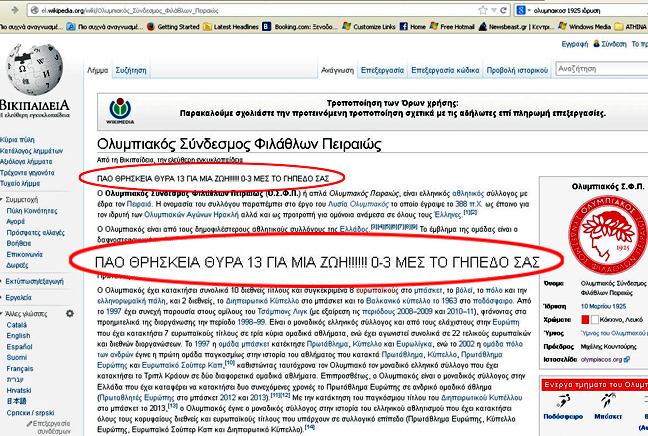 Πολλά τα πειράγματα που έγιναν εκατέρωθεν τις τελευταίες μέρες, χαρακτηριστικό το παράδειγμα ενός φίλου του «τριφυλλιού» που πανηγυρίζει το θρίαμβο μέσα στο επίσημο λήμμα της Βικιπαιδείας για τον Ολυμπιακό.