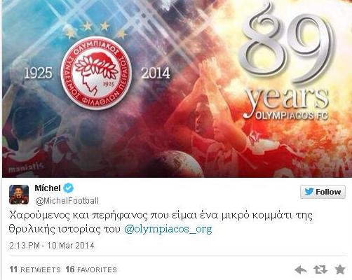 Το δικό του μήνυμα για τα 89α γενέθλια από την ίδρυση του Ολυμπιακού θέλησε να στείλει ο Μίτσελ, γράφοντας ένα σχόλιο στην προσωπική του σελίδα στο Twitter.