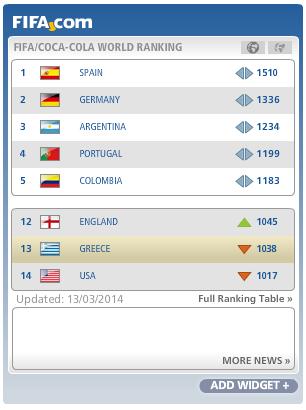Όσον αφορά τώρα τους αντιπάλους της Εθνικής για το Μουντιάλ της Βραζιλίας, η Κολομβία παρέμεινε στην 5η θέση, η Ακτή Ελεφαντοστού από την 23η υποχώρησε μία θέση και η Ιαπωνία ανέβηκε δύο θέση (48η από 50η).