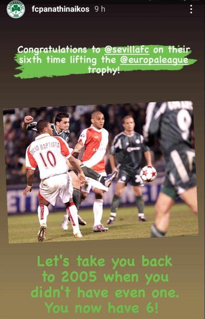 Μέσα από ένα story στο Instagram οι «πράσινοι» θύμισαν στην ομάδα της Ανδαλουσίας το τρομερό γκολ του Λουκά Βύντρα το 2005 στη Λεωφόρο, όταν δεν είχε κατακτήσει κάποιο ευρωπαϊκό τρόπαιο.
