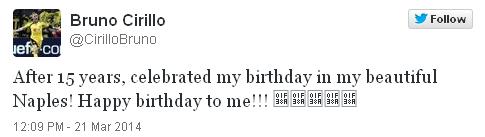 «Μετά από 15 χρόνια γιορτάζω τα γενέθλιά μου στη όμορφή μου Νάπολι! Χρόνια μου Πολλά!!!», έγραψε στο Twitter.