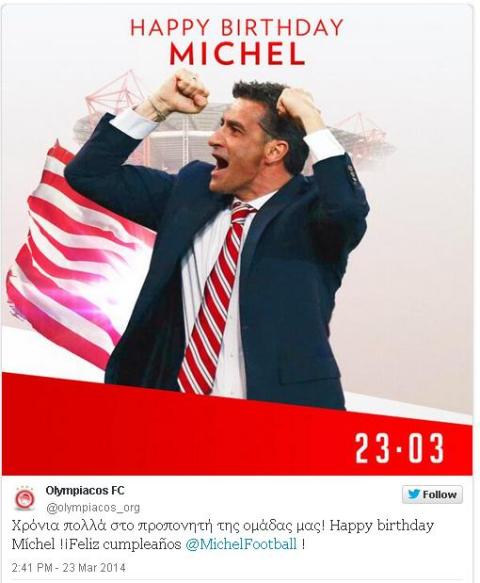 Μέσω του επίσημου λογαριασμού στο Twitter της ομάδας ο Ολυμπιακός ευχήθηκε στον Μίτσελ για τα γενέθλια του.