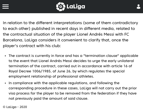 Σε ανακοίνωσή της, η διοργανώτρια αρχή του πρωταθλήματος στηρίζει τους «μπλαουγκράνα», σημειώνοντας ότι η ρήτρα των 700 εκατ. ευρώ που υπάρχει στο συμβόλαιο του Αργεντινού είναι ενεργή.