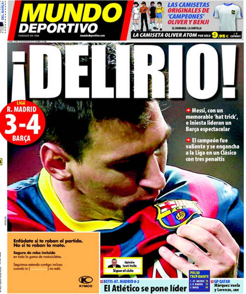 El Mundo Deportivo: «Ντελίριο! Ο Μέσι με ένα αξέχαστο χατ-τρικ και ο Ινιέστα οδήγησαν μια εξαιρετική Μπαρτσελόνα στη νίκη. Οι πρωταθλητές ήταν θαρραλέοι και μπήκαν ξανά στη διεκδίκηση του τίτλου σε ένα κλάσικο με τρία πέναλτι».