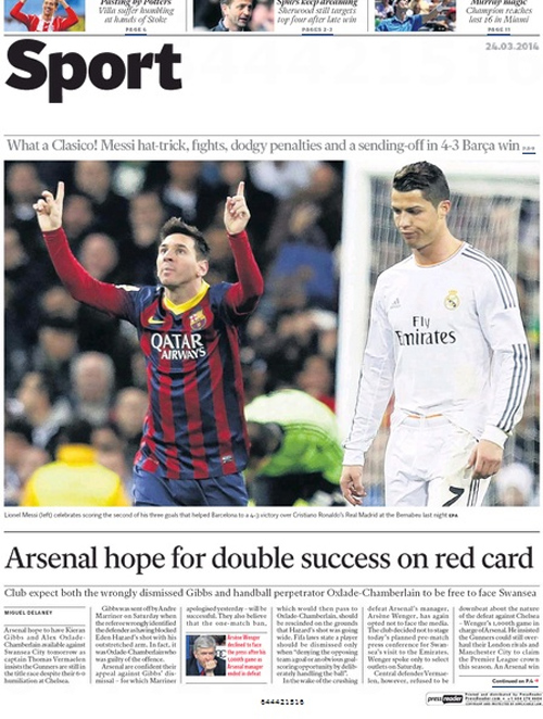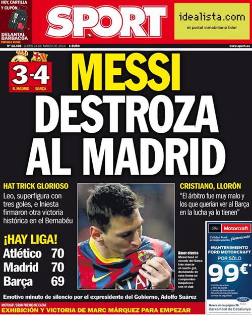 Sport: «Ο Μέσι κατέστρεψε τη Ρεάλ! Ο Λέο ήταν ο μεγάλος πρωταγωνιστής με χατ-τρικ και μαζί με τον Ινιέστα υπέγραψαν τον ιστορικό θρίαμβο. Ο Κριστιάνο έκλαιγε πάλι για τη διαιτησία».