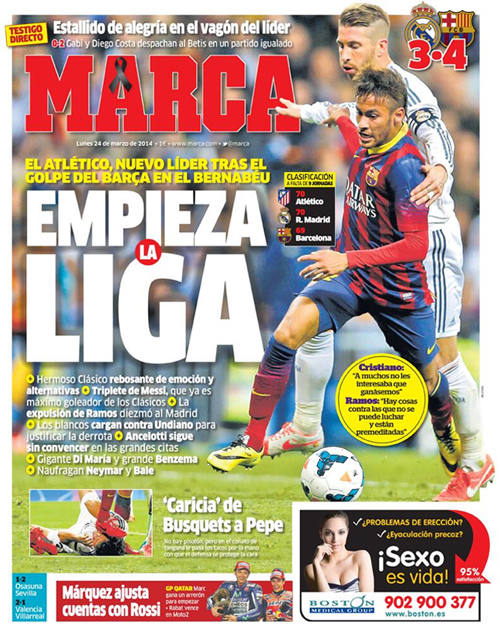 Marca: «Το πρωτάθλημα τώρα αρχίζει. Η Ατλέτικο νέα πρωτοπόρος μετά τη νίκη της Μπαρτσελόνα στο Μπερναμπέου. Η αποβολή του Ράμος έβλαψε τη Ρεάλ. Ο Αντσελότι συνεχίζει να μην πείθει στα μεγάλα παιχνίδια».