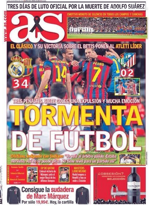 As: «Ποδοσφαιρική θύελλα. Τρία πέναλτι, επτά γκολ, μία αποβολή και πολλή ένταση. Μετά το κλάσικο και τη νίκη της επί της Μπέτις η Ατλέτικο είναι πρωτοπόρος».