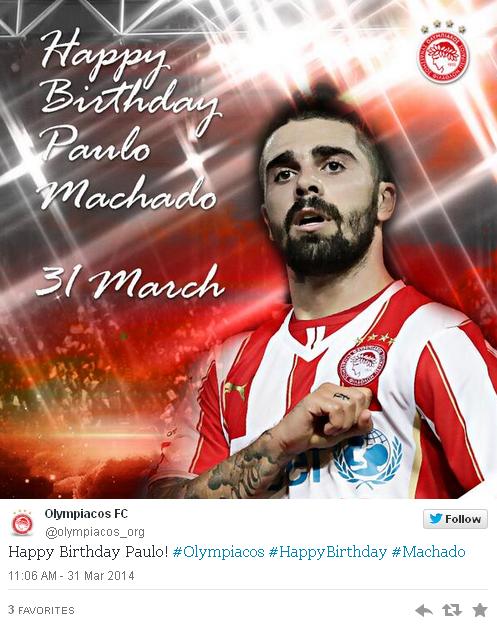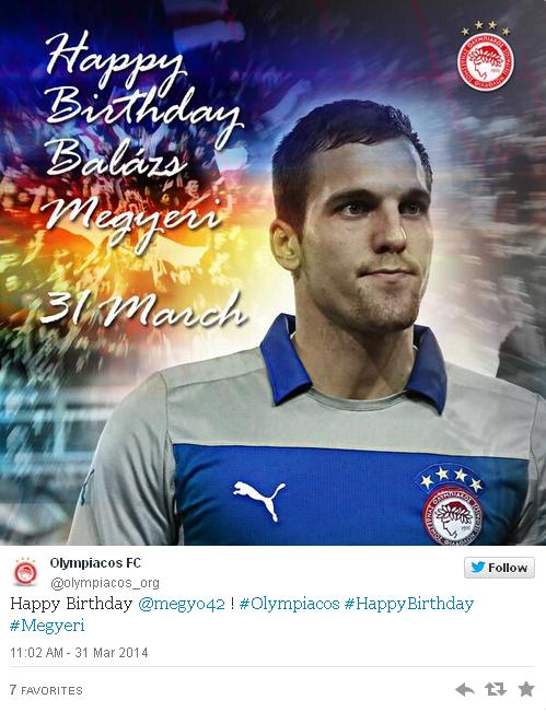 Τα γενέθλιά τους έχουν σήμερα ο Μπάλαζ Μέγιερι, ο οποίος γίνεται 24 ετών, και ο Πάουλο Μασάντο, ο οποίος είναι τέσσερα χρόνια μεγαλύτερος, με τον Ολυμπιακό να εύχεται στους δύο ποδοσφαιριστές, μέσω του επίσημου λογαριασμού του στο Twitter.