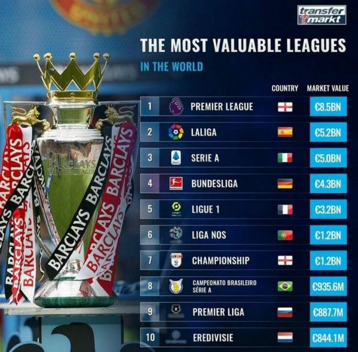 Η γνωστή ιστοσελίδα «TransferMarkt» έφτιαξε τη λίστα με τα δέκα πιο ακριβά πρωταθλήματα του κόσμου.
