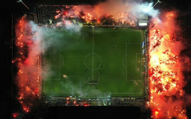 Οι οπαδοί των κίτρινων με τα καπνογόνα που άναψαν… έβαλαν φωτιά στο «Κλεάνθης Βικελίδης» και η φωτογραφία άρεσε τόσο ώστε να βραβευτεί, όπως ανακοίνωσε ο φωτογράφος που κατηύθυνε το drone, Δημήτρης Τοσίδης.