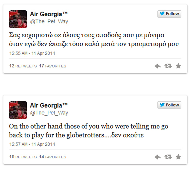 Ο Βασίλης Σπανούλης μετά το νικητήριο τρίποντο απέναντι στον Παναθηναϊκό φώναζε στην κερκίδα «Δεν ακούω» θέλοντας να απαντήσει σε όσους του ασκούσαν κριτική για την απόδοσή του. Σε ανάλογο ύφος ο Μπρεντ Πέτγουεϊ απάντησε στους επικριτές του μέσω Twitter χρησιμοποιώντας μάλιστα ελληνικά (έστω και με κάποια λαθάκια).