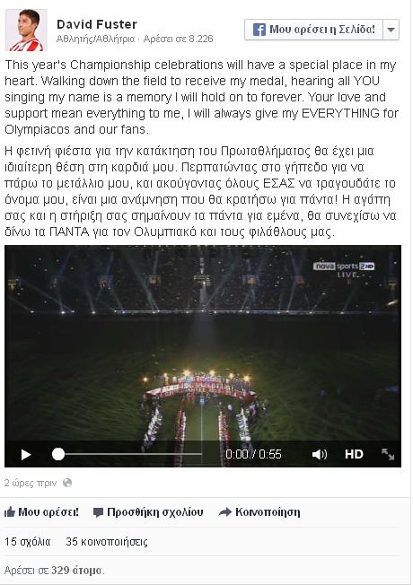 Τον καλύτερό του εαυτό για τον Ολυμπιακό και τους οπαδούς του θα συνεχίσει να δίνει ο Νταβίντ Φουστέρ, όπως έγραψε στην προσωπική του σελίδα στο Facebook.