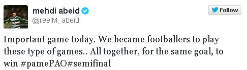 Μήνυμα πρόκρισης στέλνει ο Μεχντί Αμπέντ. Ο Αλγερινός μέσος του Παναθηναϊκού μέσω Twitter δεν κρύβει την ανυπομονησία του για τον επαναληπτικό ημιτελικό του Κυπέλλου με τον ΟΦΗ.