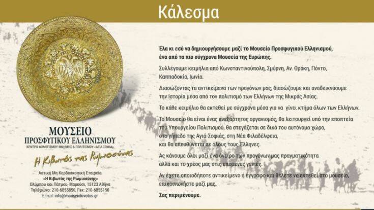 «Έλα κι εσύ να δημιουργήσουμε μαζί το Μουσείο Προσφυγικού Ελληνισμού, ένα από τα πιο σύγχρονα Μουσεία της Ευρώπης.