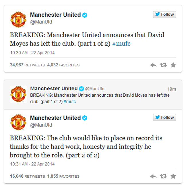 «Η Μαν. Γιουνάιτεντ ανακοινώνει ότι ο Ντέιβιντ Μόγες αποχώρησε από το σύλλογο. Η διοίκηση του συλλόγου θα ήθελε να τον ευχαριστήσει για τη σκληρή δουλειά, την εντιμότητα και την αξιοπρέπεια με την οποία εργάστηκε», αναφέρει η ανακοίνωση των «κόκκινων διαβόλων».