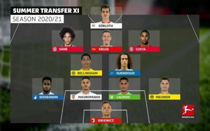 Οι άλλοι δέκα, με τη Bundesliga να τους τοποθετεί σε σύστημα 4-2-3-1 όπως μπορείτε να δείτε και στην παρακάτω φωτογραφία, είναι οι Γκίκιεβιτς (Άουγκσμπουργκ), Μενιέ (Ντόρτμουντ), Λακρουά (Βόλφσμπουργκ), Σεσενιόν (Χόφενχαϊμ), Γκεντουζί (Χέρτα), Μπέλιγχαμ (Ντόρτμουντ), Σανέ (Μπάγερν), Κρούζε (Ουνιόν), Ντάγκλας Κόστα (Μπάγερν) και Σόρλοθ (Λειψία).