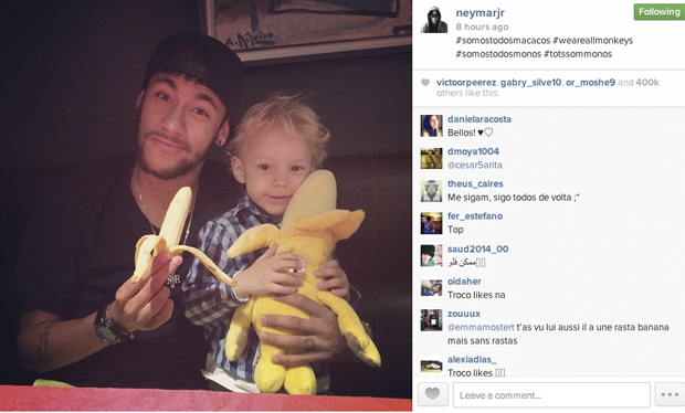 Ο Βραζιλιάνος επιθετικός ανέβασε στο instagram φωτογραφία στην οποία ποζάρει με τον γιο του αγκαλιά κρατώντας μπανάνες. Η φωτογραφία συνοδεύεται από τα hashtags #somostodosmacacos #weareallmonkeys (είμαστε όλοι μαϊμούδες), τα οποία έγιναν μέσα σε λίγες ώρες τα πιο δημοφιλή.