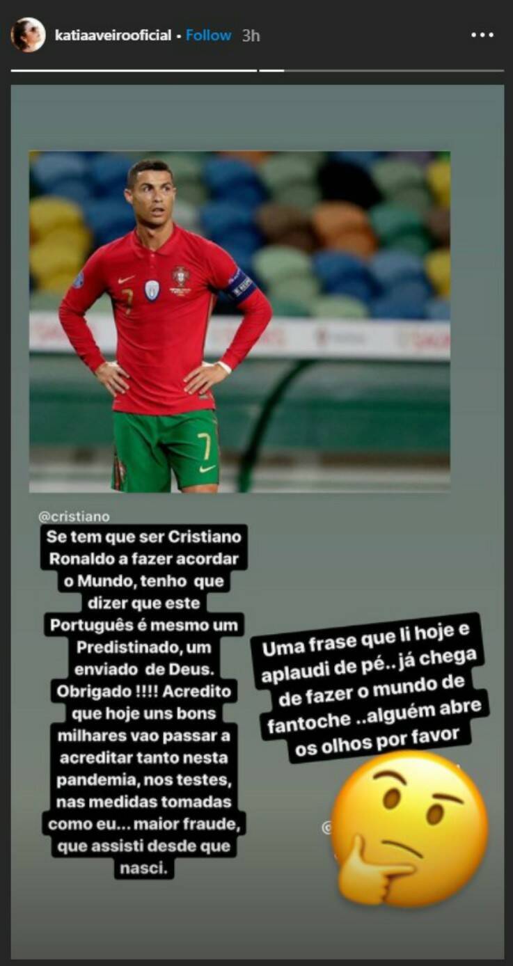 «Είναι η ευκαιρία να ξυπνήσει ο κόσμος και αν όντως έχει επιλεχθεί ο Κριστιάνο για να το κάνει αυτό, τότε είναι σταλμένος από τον Θεό! Τα μέτρα, η πανδημία, ο κορονοϊός, είναι το μεγαλύτερο ψέμα που έχω δει στη ζωή μου!», ήταν όσα έγραψε.