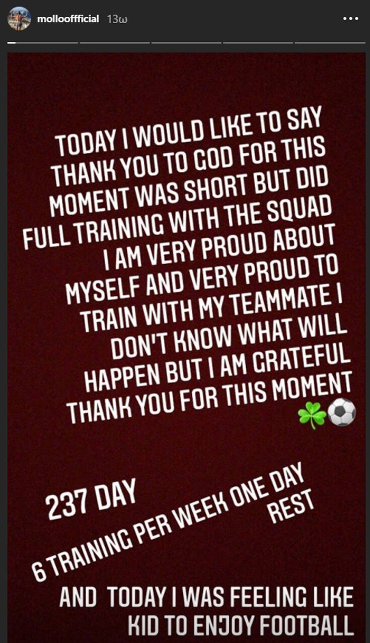 Ο Μολό είναι ένας από αυτούς, το απόγευμα της Δευτέρας έκανε κανονική προπόνηση στην πρώτη παρουσία του Μπόλονι στο προπονητικό κέντρο του «τριφυλλιού» και σχολίασε σχετικά στα social media: