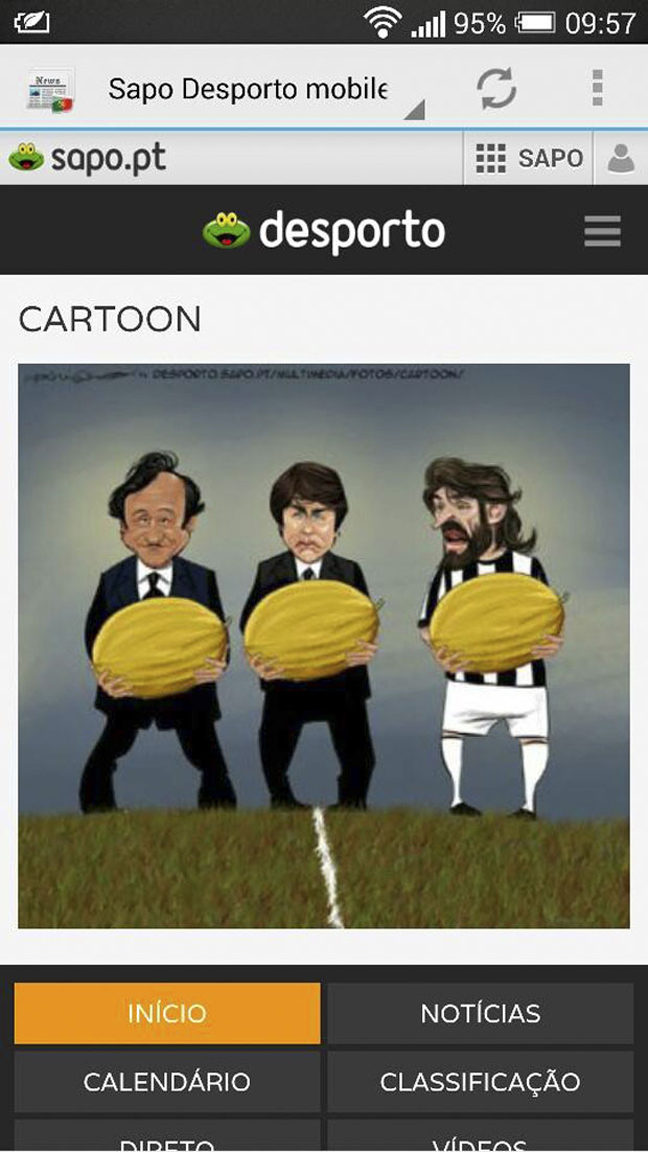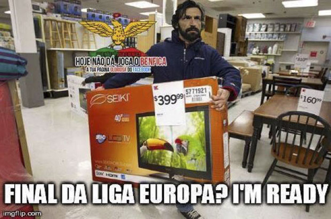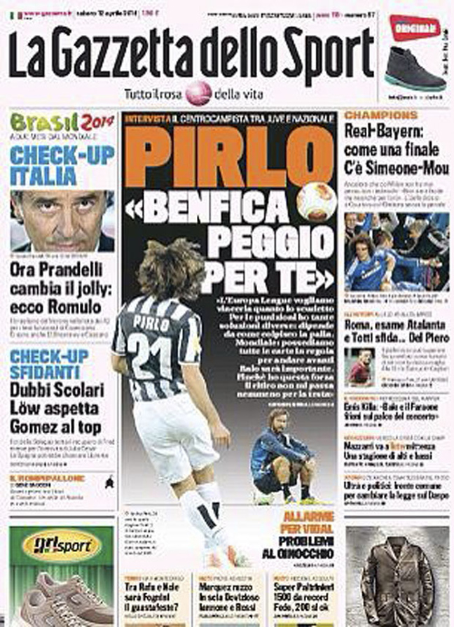 «Στις 12 Απριλίου με αφορμή την κλήρωση για τα ημιτελικά του Γιουρόπα Λιγκ, η οποία έστειλε την Μπενφίκα αντιμέτωπη της Γιουβέντους είχες πει: Η Μπενφίκα έκανε μια καλή διαδρομή και έφτασε στα ημιτελικά της διοργάνωσης, έχει μια εξαιρετική σεζόν και είναι ομάδα τεχνικά προικισμένη. Λυπάμαι για αυτούς αλλά… (πρωτοσέλιδο της Gazzetta dello Sport)».