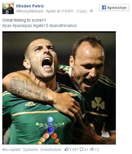 Αν και ο Παναθηναϊκός δεν μπόρεσε να νικήσει τον ΠΑΟΚ στη Λεωφόρο, ο Μλάντεν Πέτριτς παρουσιάζεται χαρούμενος που κατάφερε να πετύχει το πρώτο του γκολ με τη φανέλα του «τριφυλλιού» που ήταν το πρώτο σε συλλογικό επίπεδο από τον Δεκέμβρη του 2012.