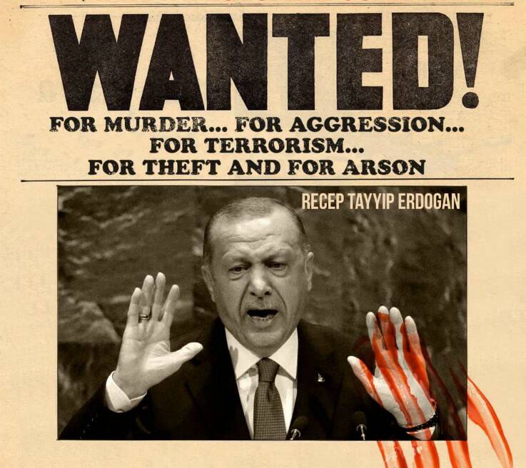 Εκεί, δείχνει τον Ερντογάν να καταζητείται, με τη σχετική αφίσα σε τέτοιες περιπτώσεις, αναφέροντας ότι είναι καταζητούμενος «για φόνο. Για επιθετικότητα. Για τρομοκρατία. Για κλοπή και για εμπρησμό».