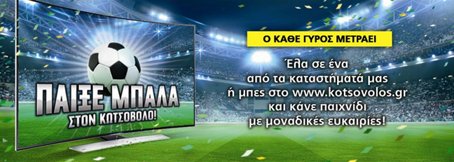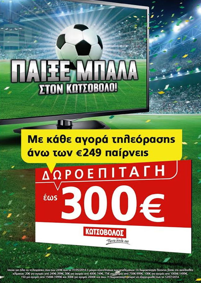 Ο «πρώτος γύρος ποδοσφαιρικών προσφορών» ξεκίνησε και θα διαρκέσει έως τις 31 Μαΐου. Σε αυτό το διάστημα όλοι όσοι επιλέξουν μια νέα τηλεόραση αξίας άνω των 249 ευρώ από την Κωτσόβολος, θα κερδίζουν δωροεπιταγές για να πραγματοποιήσουν επιπλέον αγορές αξίας έως και 300 ευρώ.
