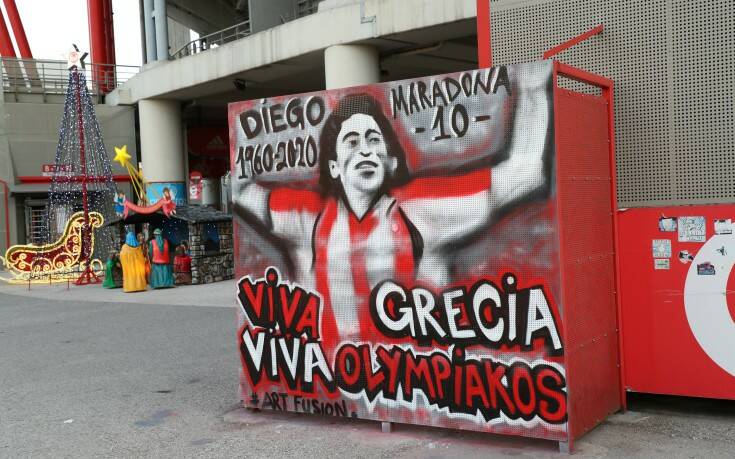 Ο Αργεντίνος θρύλος ήταν καλεσμένος της ερυθρόλευκης ΠΑΕ και είχε μπει στον αγωνιστικό χώρο του γηπέδου, με την εικόνα να γίνεται γκράφιτι πλέον στο «Γεώργιος Καραϊσκάκης», με τις ελληνικές ομάδες και τους Έλληνες οπαδούς να τιμούν τον Μαραντόνα, όπως έγινε και στο γήπεδο της Τούμπας από την πλευρά του ΠΑΟΚ.