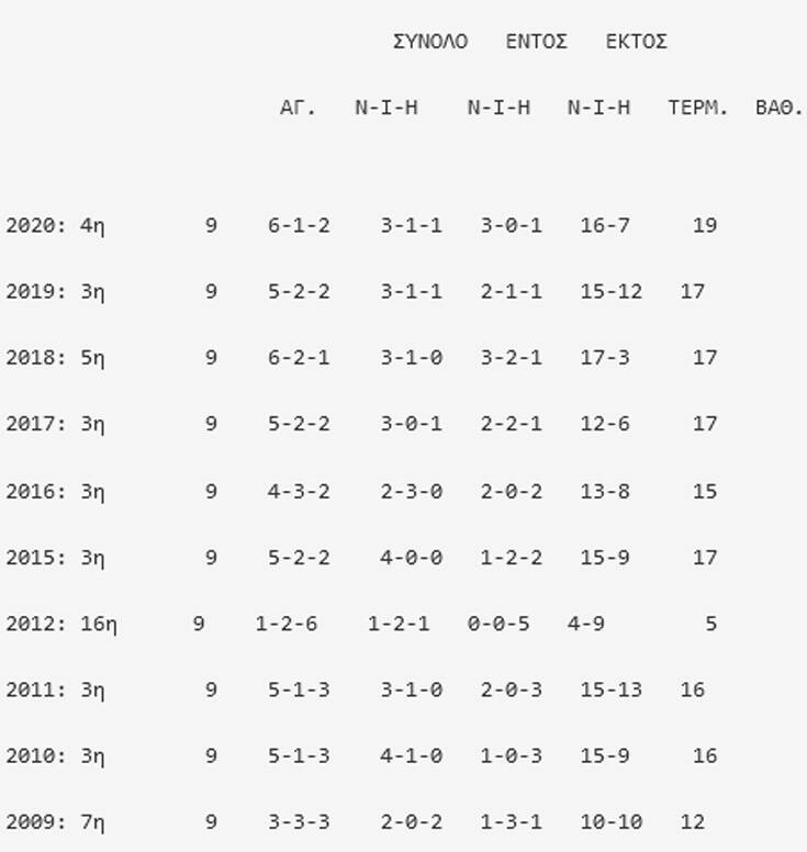 Αναλυτικά οι θέσεις και η συγκομιδή της ΑΕΚ στις τελευταίες δέκα παρουσίες της στη Super League, μετά από εννέα αγώνες.
