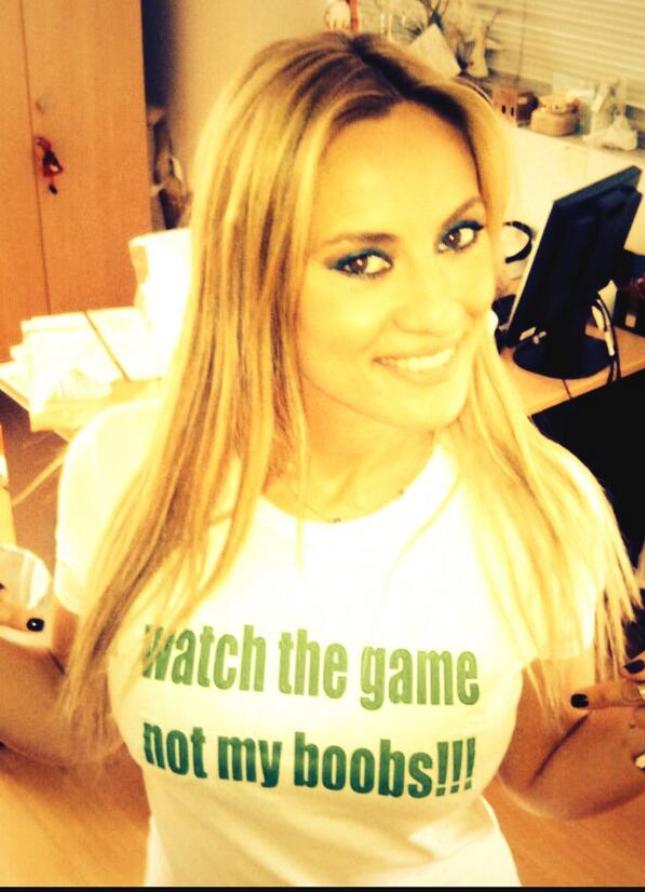 Στον δεύτερο πήγε ντυμένη με μια άλλη που ζητούσε απ’ τους φιλάθλους να προσηλωθούν στο μπάσκετ και όχι στο στήθος της.