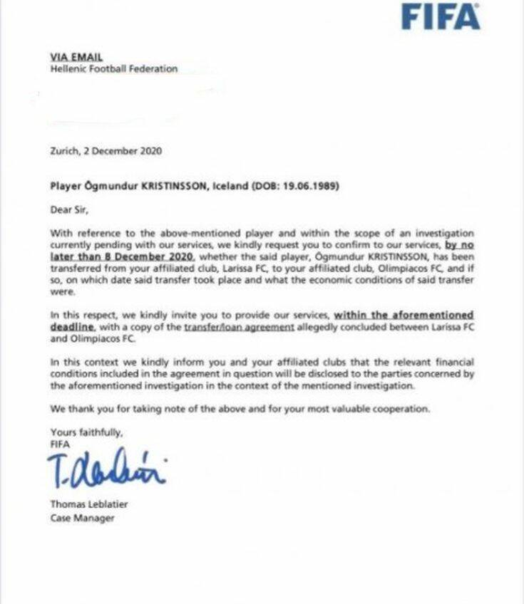 «Αναφορικά με τον προαναφερόμενο παίκτη και στο πλαίσιο εκκρεμούς έρευνας με τις υπηρεσίας μας, θα θέλαμε να σας ζητήσουμε να επιβεβαιώσετε στις υπηρεσίες μας όχι αργότερα από τις 8 Δεκεμβρίου 2020 αν ο ποδοσφαιριστής Όγκμουντουρ Κρίστινσον έχει μετεγγραφεί από το συνδεδεμένο κλαμπ σας Λάρισα στο συνδεδεμένο κλαμπ σας Ολυμπιακός και, αν ναι, πότε έγινε η συγκεκριμένη μεταγραφή και ποιες ήταν οι οικονομικές συνθήκες της συγκεκριμένης μεταγραφής.