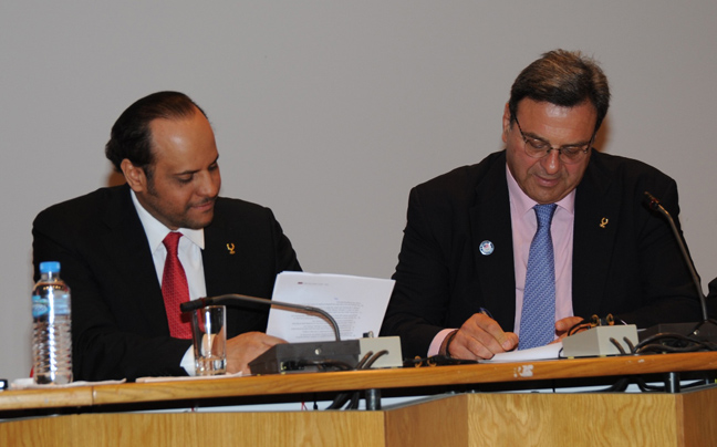 Ο Ισίδωρος Κούβελος, πρόεδρος Ελληνικής Ολυμπιακής Ακαδημίας και ο σεΐχης Saoud bin Abdulrahman Al Thani, γενικός γραμματέας της Ολυμπιακής Επιτροπής του Κατάρ υπογράφουν το Μνημόνιο Συνεργασίας.