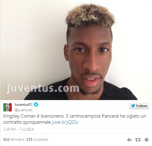 Ο Κίνγκσλεϊ Κομάν είναι παίκτης της Γιουβέντους. Οι «μπιανκονέρι» ανακοίνωσαν την απόκτηση του 18χρονου Γάλλου μεσοεπιθετικού, ο οποίος υπέγραψε πενταετές συμβόλαιο.