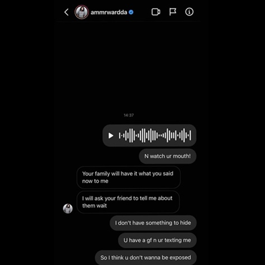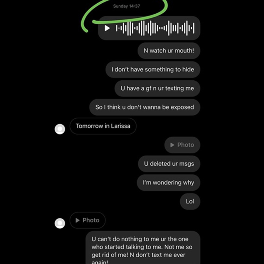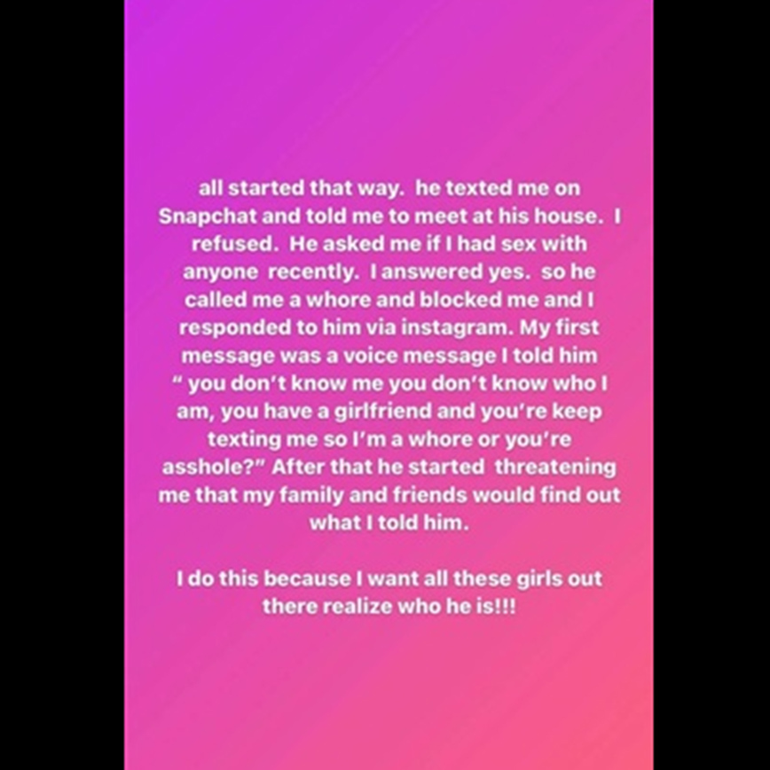 Και συνεχίζει: «Στη συνέχεια μού έστειλε στο Snapchat και μου ζήτησε και πάλι να συναντηθούμε στο σπίτι του. Αρνήθηκα ξανά και με ρώτησε αν έχω κάνει σεξ πρόσφατα. Απάντησα ”ναι”. Τότε με αποκάλεσε πόρνη, με μπλόκαρε εκ νέου, αλλά τον βρήκα μετά από λίγο καιρό στο Instagram και του έστειλα ένα ηχητικό μήνυμα: ”Δεν με ξέρεις, δεν ξέρεις ποια είμαι, έχεις κοπέλα και συνεχίζεις να μου στέλνεις μηνύματα, οπότε εγώ είμαι η πόρνη ή εσύ ο μ@@@;”. Μετά από αυτό άρχισε να με απειλεί ότι θα πει αυτό που του είπα στην οικογένειά μου και στους φίλους μου. Το κάνω αυτό γιατί θέλω όλα τα κορίτσια να μάθουν ποιος είναι».