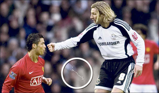 Οι σκληρές προσπάθειες του Robbie Savage να σταματήσει τον καλπασμό του Κριστιάνο Ρονάλντο στη νίκη με 4-1 της Μάντσεστερ έναντι της Ντέρμπι το 2008 είδαν τους δύο παίκτες να συγκρούονται συχνά. Κι έτσι ο Ρονάλντο, πεσμένος στα γόνατα, δεν δίστασε να φτύσει κάποια στιγμή τον Savage, που ήταν όρθιος μπροστά του, στη βουβωνική χώρα! Πιο συμβολικό δεν γίνεται…