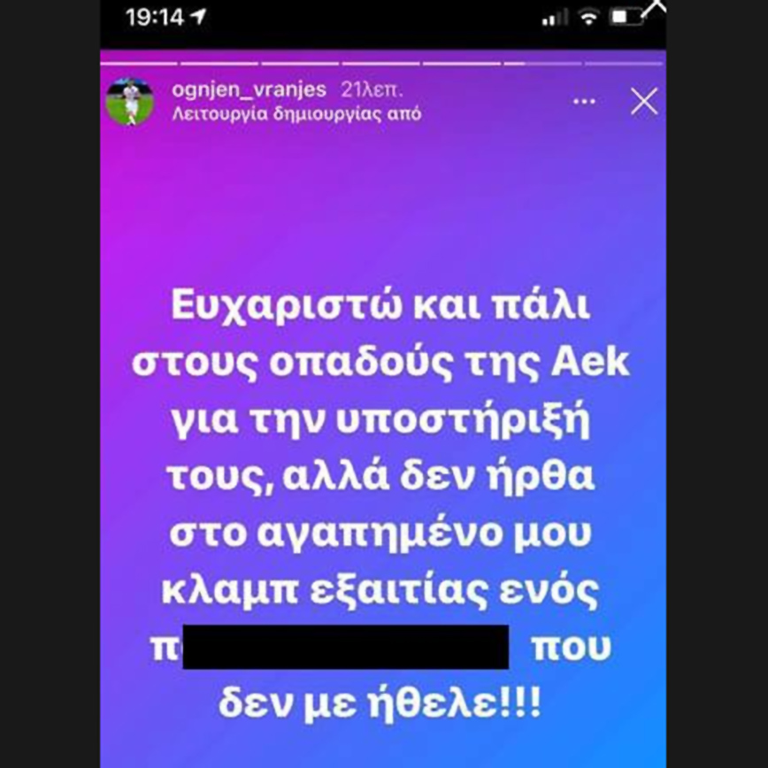 «Ευχαριστώ και πάλι τους οπαδούς της ΑΕΚ για την υποστήριξή τους, αλλά δεν ήρθα στο αγαπημένο μου κλαμπ εξαιτίας ενός π@@@@@ που δεν με ήθελε», έγραψε ο Βράνιες στο Instagram.