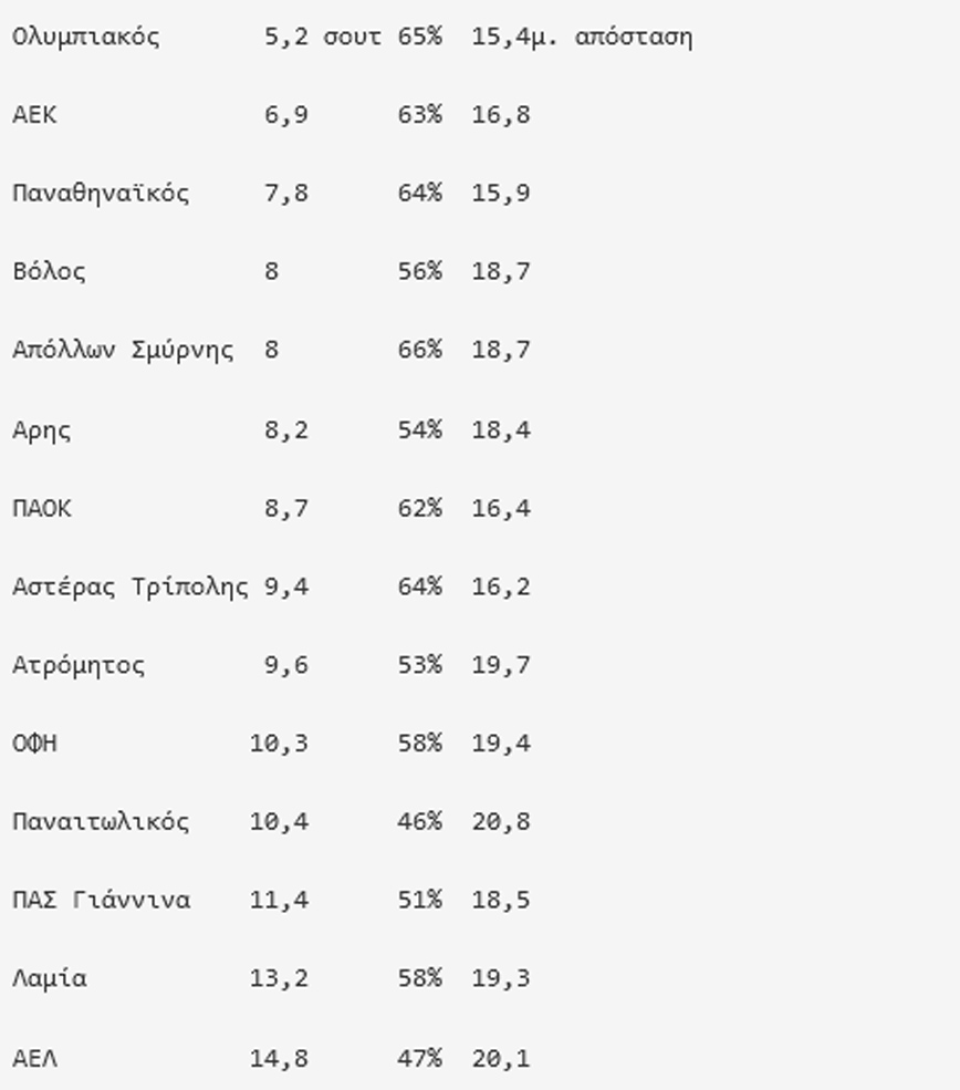 Μπροστά από τον πρωτοπόρο της ελληνικής Super League, βρίσκεται μόνο το Αμβούργο (από την β’ κατηγορία της Γερμανίας), με 4,7 σουτ ανά γκολ (65% και 15,3 μ. απόσταση), ενώ το βάθρο συμπληρώνει η Μπάγερν με 5,3 σουτ ανά γκολ (63% και 16,5 μ. απόσταση). Η κατάταξη στην ελληνική Super League.