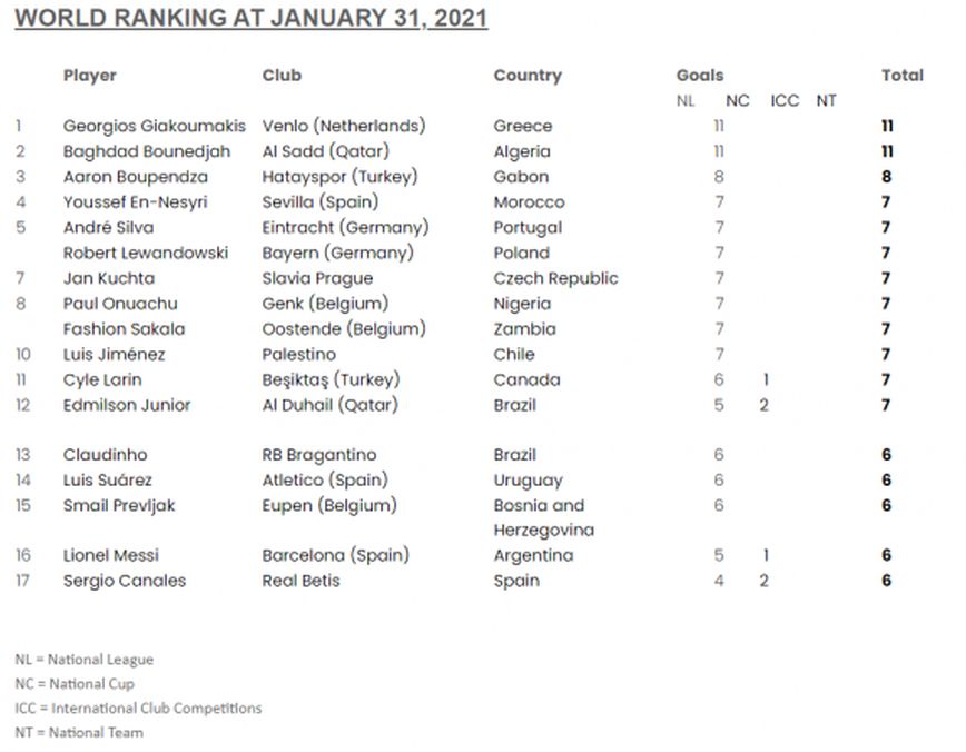 Ο Έλληνας επιθετικός της Φένλο, μπορεί να έχει τα ίδια γκολ με τον Αλγερινό επιθετικό της Αλ Σαντ, Μπαγκντάντ Μπουνετζάχ, αφού αμφότεροι έως 31 Ιανουαρίου πέτυχαν από 11 τέρματα, όμως είναι πρώτος στην κατάταξη, αφού το πρωτάθλημα της Eredivisie είναι πιο ψηλά στην κατάταξη της IFFHS, από τη Star League του Κατάρ.
